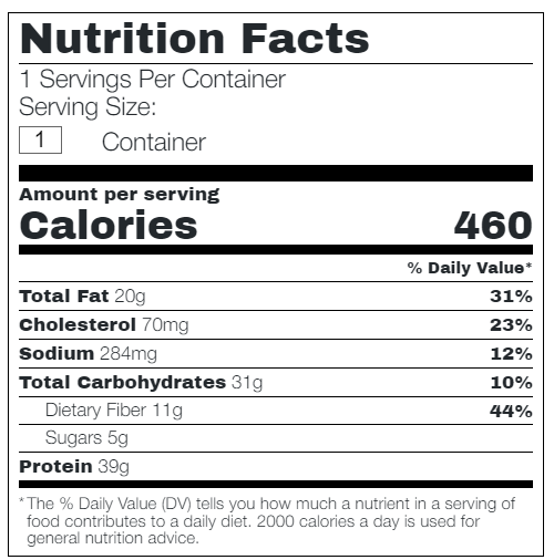 Instructions: We recommend freezing meals that will not be consumed within 3 days. Microwave on high for 1-2 minutes.