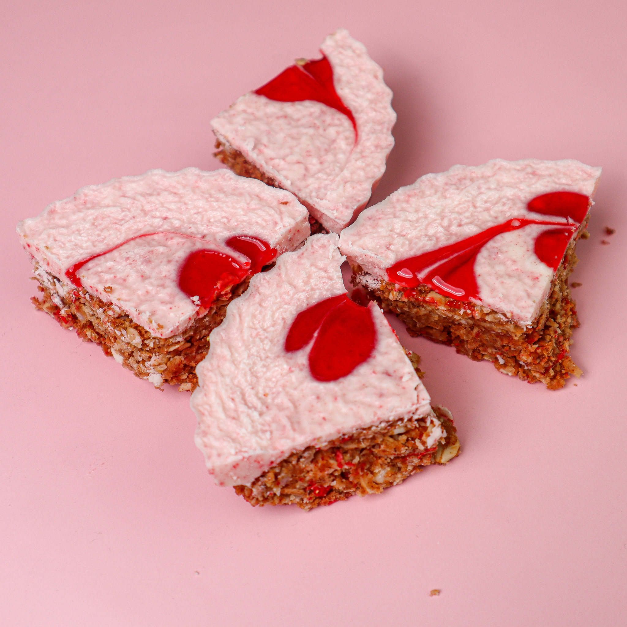 Ingredients: old fashioned rolled oats, almond butter, agave, white semi sweet chocolate chips, whey protein powder, strawberry.